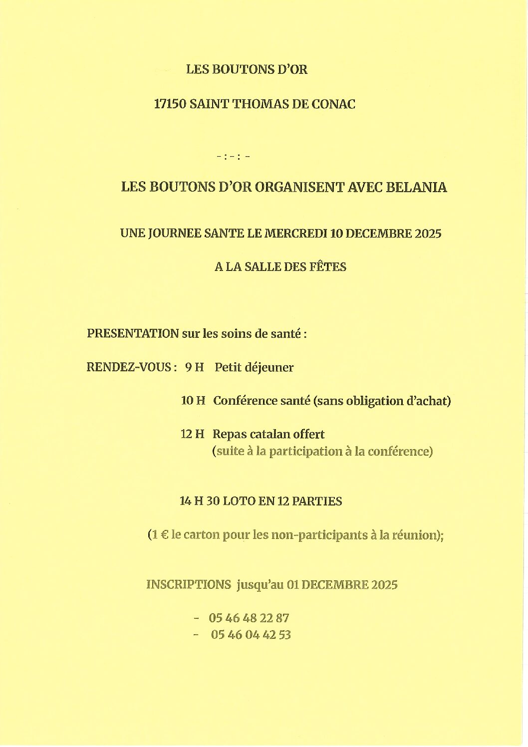 L’association Les Boutons d’Or organise avec Belania une journée santé le mercredi 10 décembre 2025 à la salle des fêtes. Programme9 heures : Petit déjeuner10 heures : Conférence santé (sans obligatoire d’achat)12 heures : Repas catalan offert (suite à la participation à la conférence)14 heures 30 : Loto en 12 parties (1,00 € le carton […]