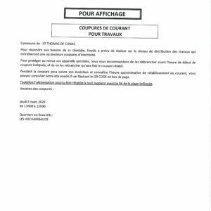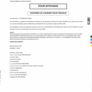 Coupures de courant pour travaux le jeudi 5 mars de 11 h 00 à 12 h 00.