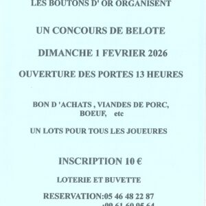 L’association Les Boutons d’Or organise un concours de belote le dimanche 1er février à la salle des fêtes de St Thomas de Conac. Ouverture des portes à 13 h 00. Bon d’achats, viandes de porc… un lot pour tous les joueurs Loterie et buvette Inscription : 10 € Réservation : 05 46 48 22 87 […]