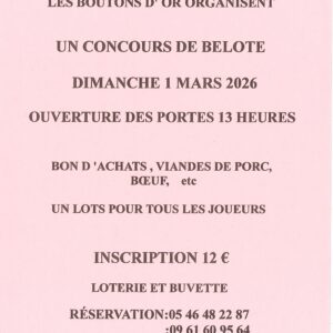 L’association Les Boutons d’Or organise un concours de belote le dimanche 1er mars à la salle des fêtes de St Thomas de Conac. Ouverture des portes à 13 h 00. Bon d’achats, viandes de porc… un lot pour tous les joueurs Loterie et buvette Inscription : 12 € Réservation : 05 46 48 22 87 […]