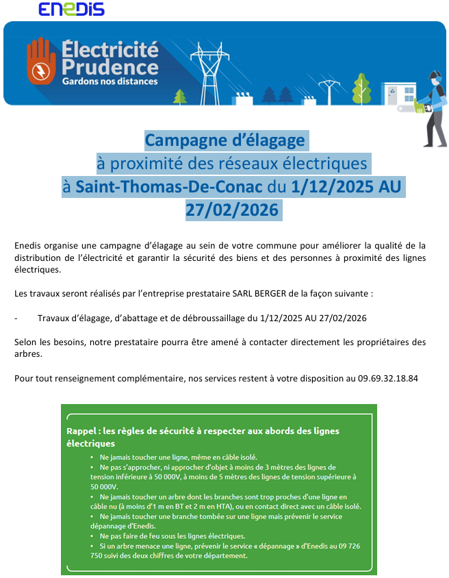 Campagne d’élagage à proximité des réseaux électriques à Saint-Thomas-De-Conac du 1er décembre 2025 au 27 février 2026.