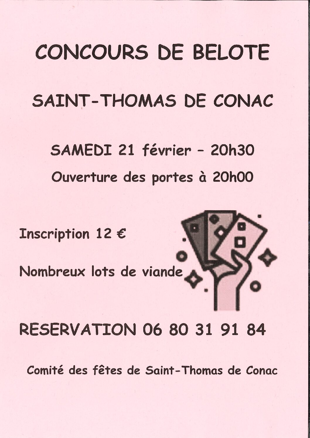 Le comité des fêtes de St Thomas de Conac organise un concours de belote le samedi 21 février à 20 heures 30 à la salle des fêtes. Ouverture des portes à 20 heures. Nombreux lots de viande. Inscription : 12,00 € Réservation : 06 80 31 91 84
