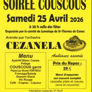 Soirée couscous organisée par le Comité de Jumelage et animée par l’orchestre CEZANELA SAMEDI 25 AVRIL à 20 H 00 à la salle des fêtes MENUApéritif Blanc CassisPotageCouscous garni préparé par Nicolas POINTREAUFromage saladeDessert glacéVin rougeCafé cognac Liqueur Prix du repas : 29,00 €Inscription jusqu’au 21 avril au 05 46 48 22 87 ou 05 […]