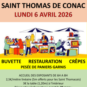 Le comité de jumelage de Saint Thomas de Conac organise le samedi 14 mars 2026 à 20 heures à la salle des fêtes une soirée choucroute. Soirée animée par l’orchestre Stéphanie MOREAUX. MENU : 29,00 €Apéritif blanc pêchePotageChoucroute garnie préparée par Nicolas POINTREAUFromage saladeDessert glacéBière pression à volontéVin blancCafé – Cognac – Liqueur Apporter son […]