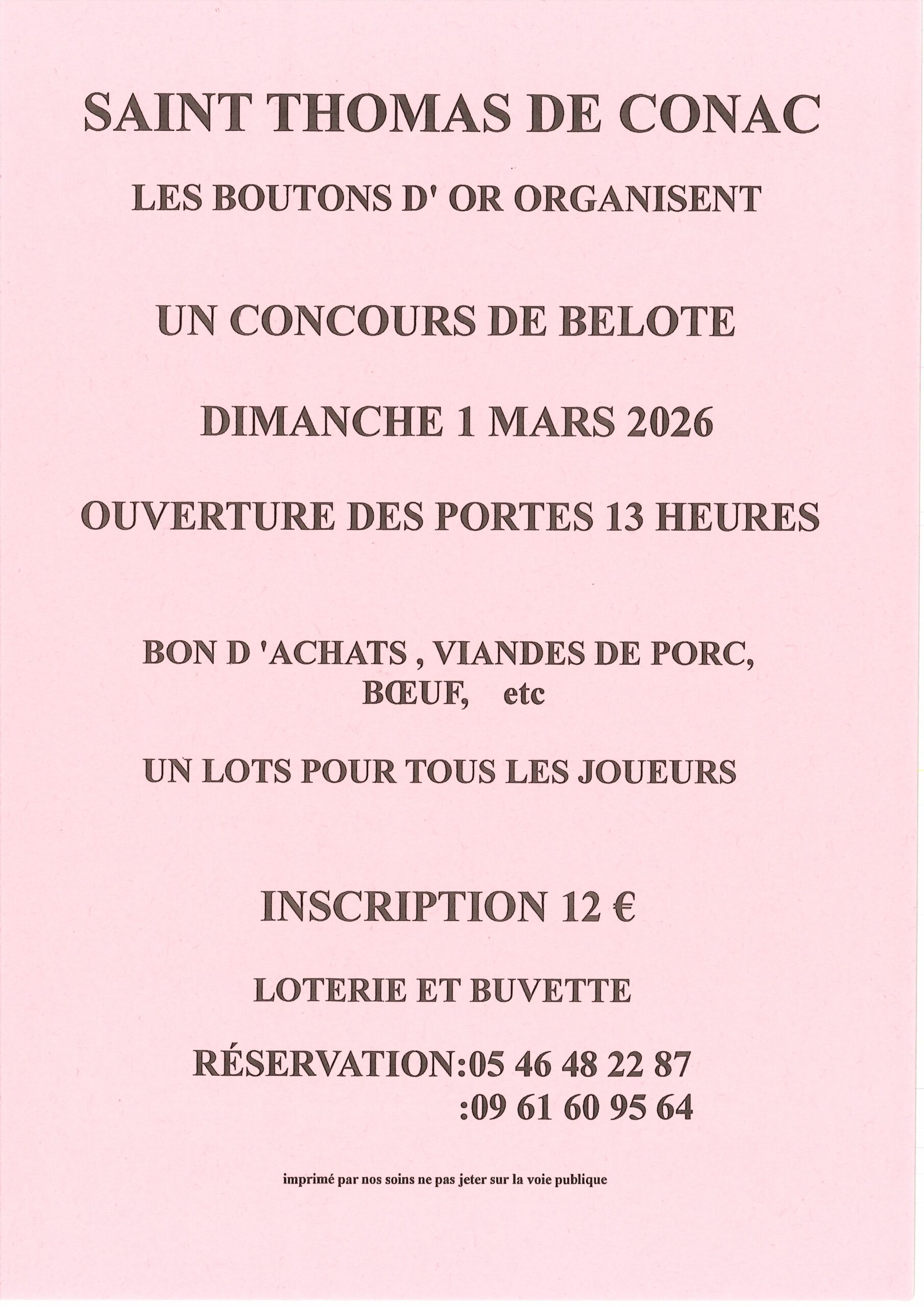 L’association Les Boutons d’Or organise un concours de belote le dimanche 1er mars à la salle des fêtes de St Thomas de Conac. Ouverture des portes à 13 h 00.