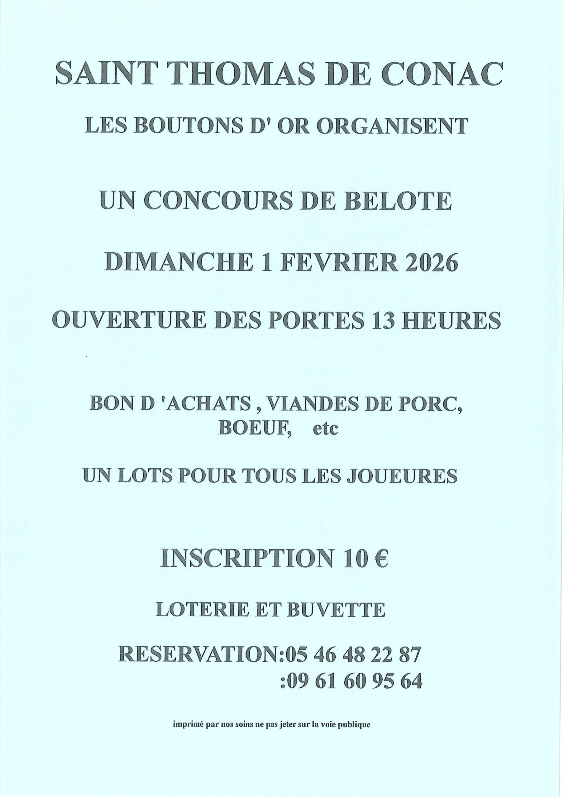 L’association Les Boutons d’Or organise un concours de belote le dimanche 1er février à la salle des fêtes de St Thomas de Conac. Ouverture des portes à 13 h 00.