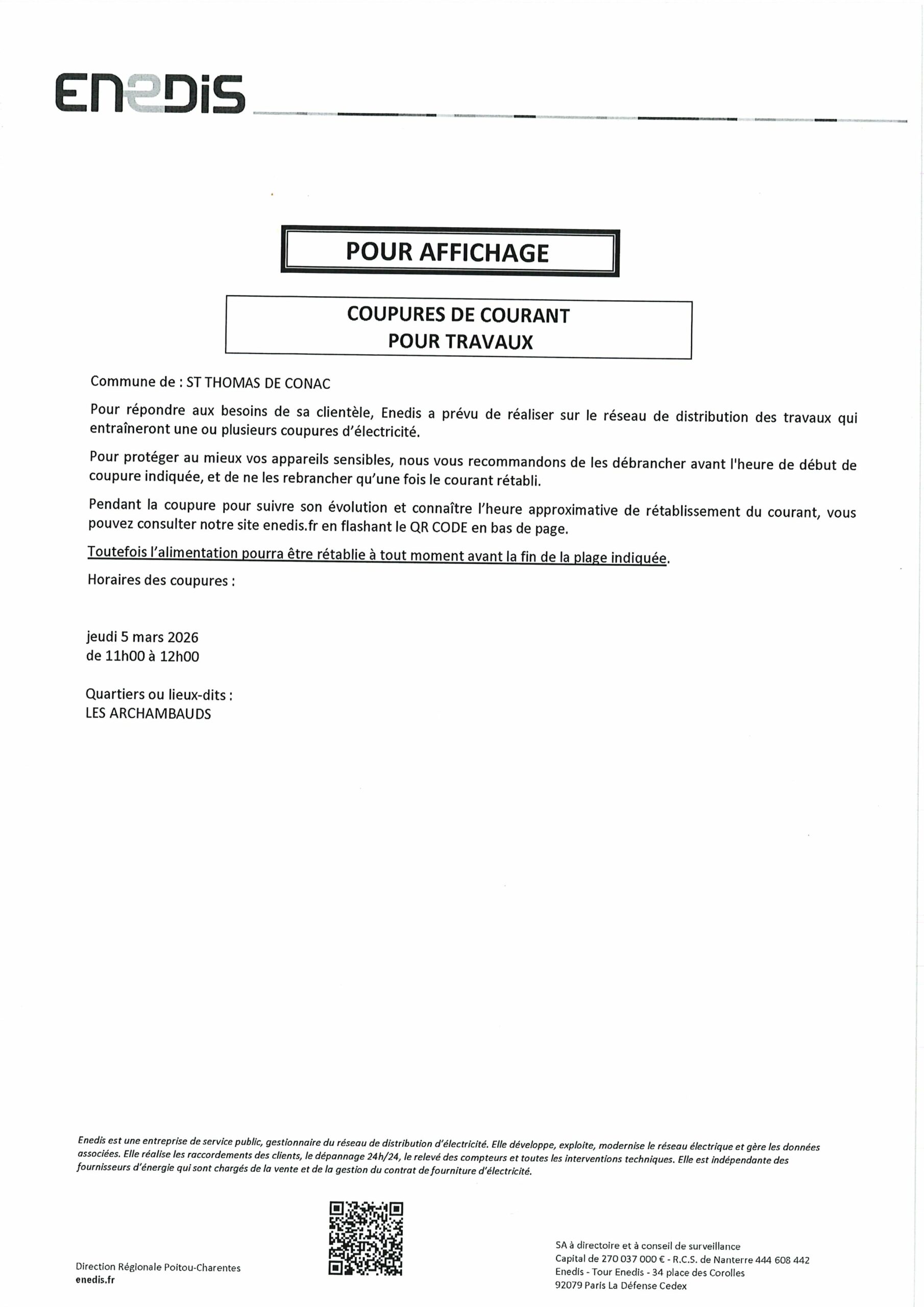 Coupures de courant pour travaux le jeudi 5 mars de 11 h 00 à 12 h 00.