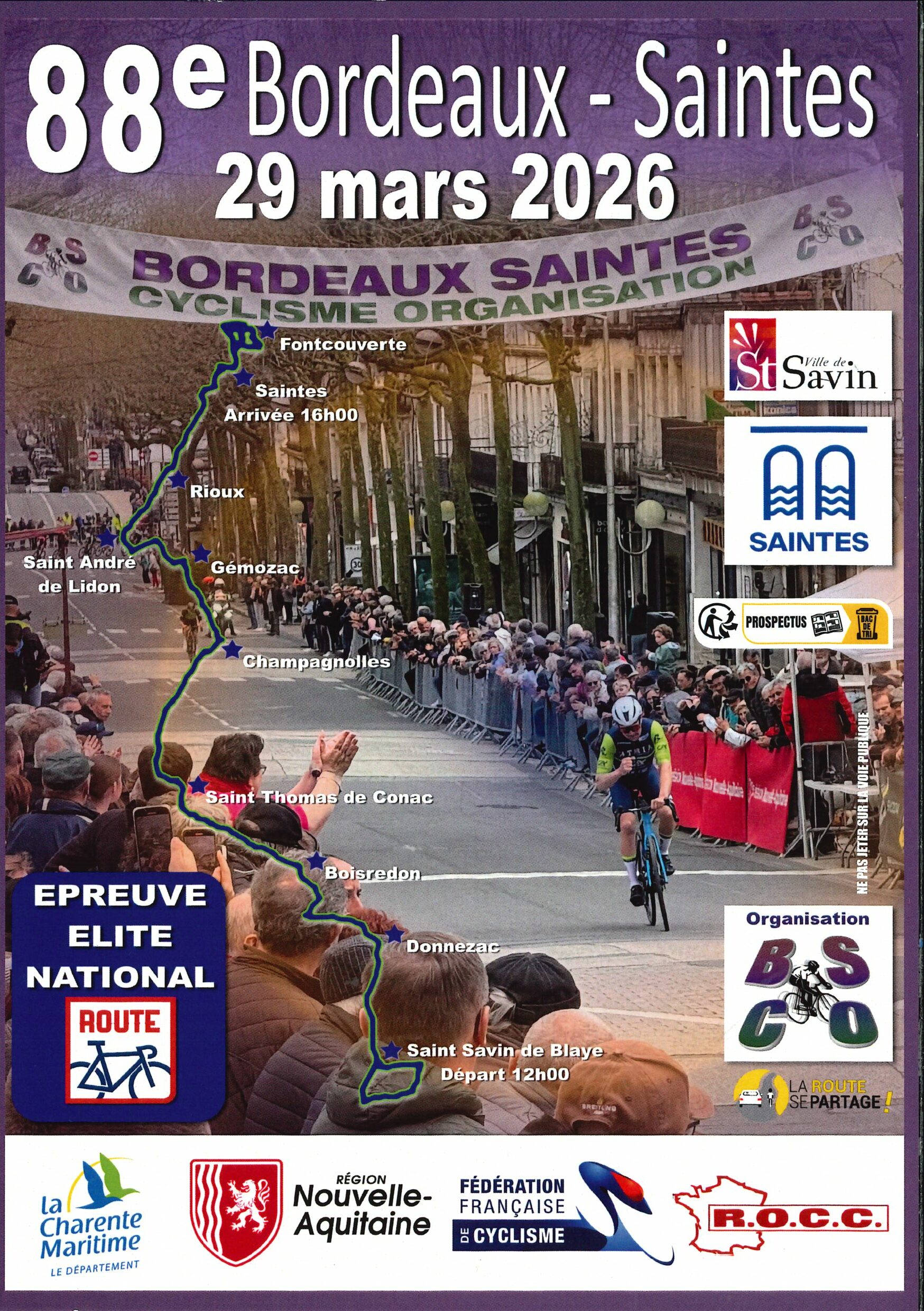 Passage sur la route Verte de la course cycliste « 88e Bordeaux Saintes » le dimanche 29 mars à 13 h 00.